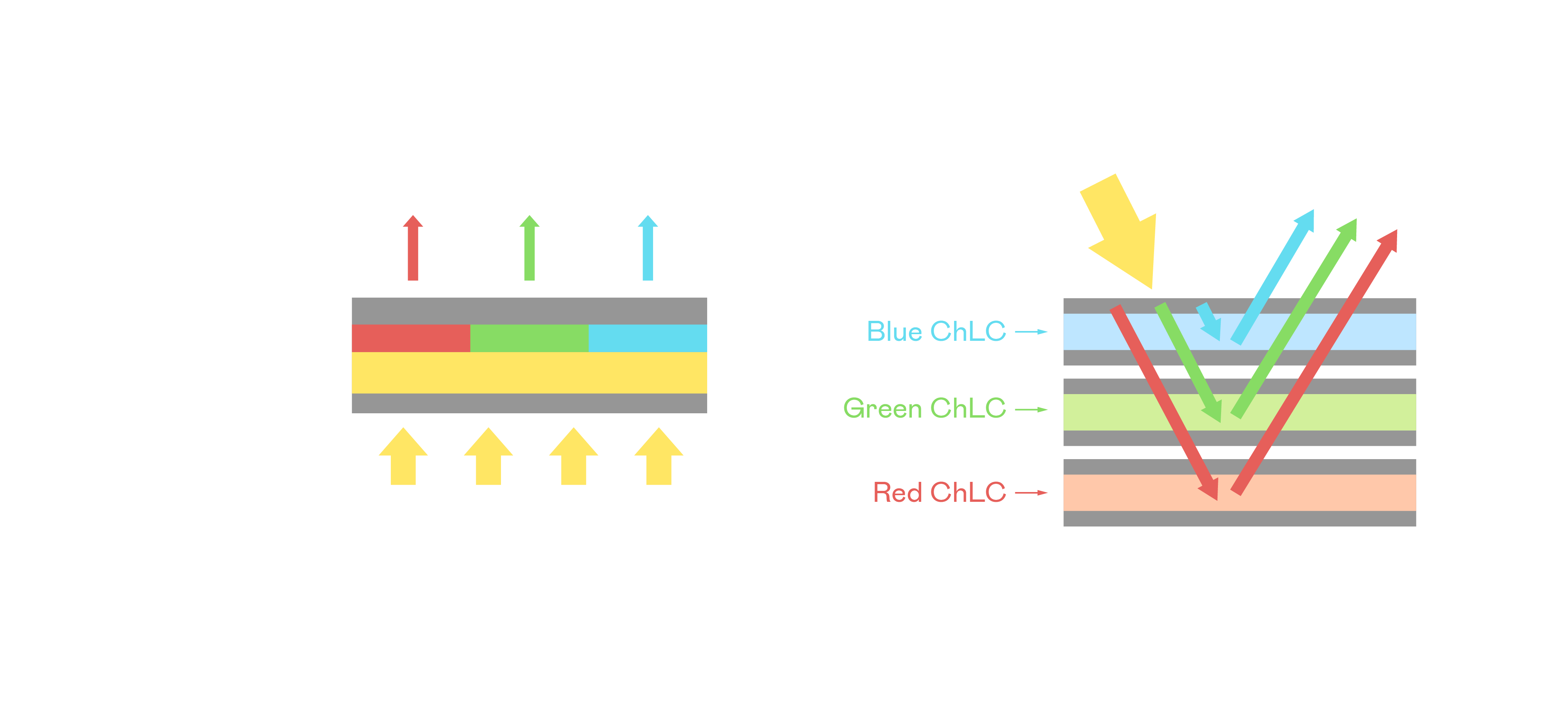 EVO视讯胆固醇液晶显示器是由红、绿、蓝三层胆固醇液晶面板堆叠而成,并采用无彩色滤光片设计,减少环境光在反射过程中的损耗。